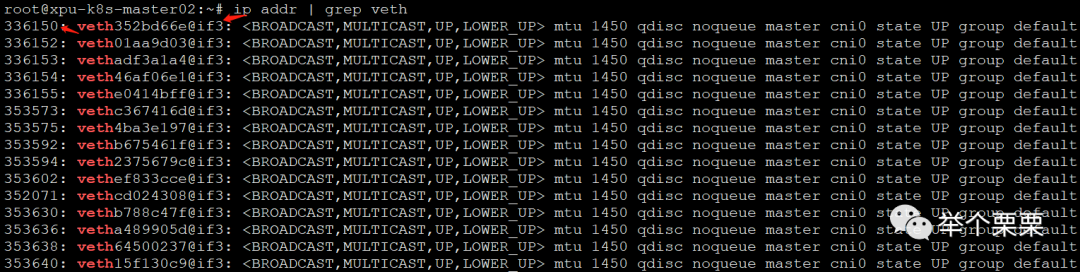 我们知道,veth对一侧在容器里面,一侧在Node侧。通过命令ip addr可以查看到。这里我们需要找到不存在容器遗留在Node的vethxxx接口。