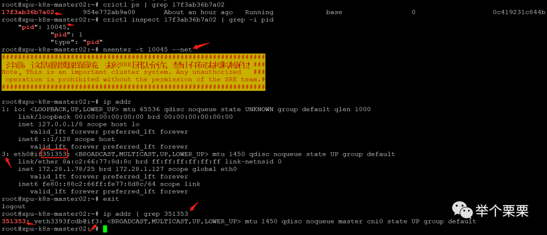 通过这样的方式找到其映射关系的。有了这个信息之后,我就可以去到该Node上所有的容器中拿到eth0对应的在Node的index ID,从而在Node侧过滤找出已经无效的vethxxx接口并删掉。操作如下: