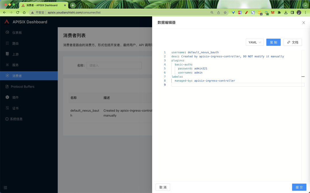 首先我们需要在 APISIX Consumer 消费者中增加 basic auth 认证配置,为其指定用户名和密码,我们这里在 APISIX Ingress 中,可以通过 ApisixConsumer