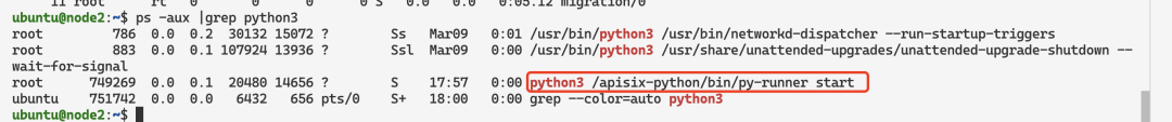 部署完成后在 APISIX 的 Pod 中可以看到会启动一个 Python Runner 的子进程: