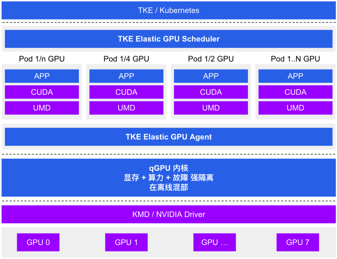 腾讯云推出的 GPU 容器共享技术,支持在多个容器间共享 GPU 卡并提供容器间显存、算力强隔离的能力,其原理与阿里云cGPU相似,此处不多介绍。