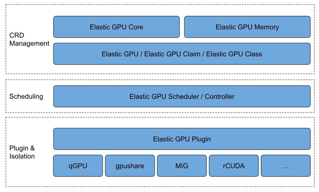 Elastic GPU(https://github.com/elastic-ai/elastic-gpu)借鉴PV PVC / StorageClass模型,定义了三种全新的 Kubernetes CRD,用于代表 GPU 资源的不同抽象: