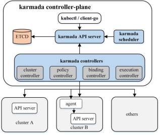 其中ETCD存储karmada API 对象,API server是所有其他组件都与之通信的REST节点,karmada controller manger 根据通过API server创建的API对象执行操作。同时,karmada controller manger运行各种controllers,这些controllers监视karmada对象,然后与member集群的API server通信,以创建常规的k8s资源对象或者CRD资源。
