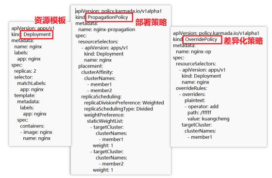 在karmada中,用户需要分别创建资源模板(resource template)、部署策略(propagation policy)和差异化配置策略(override policy)3个对象。