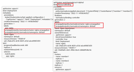 当资源对象和propagation policy匹配完成以后,通过resource detector的ApplyPolicy函数中d.BuildResourceBinding方法生成reosurce binding对象,通过d.ClaimPolicyForObject方法在资源对象的labels打上标签,如图4所示。
