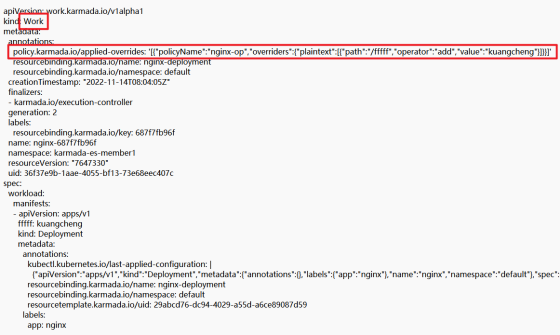 同时,overrideManager.ApplyOverridePolicies方法实现了overrides policy和work对象的绑定,具体变现为将override policy信息写的work.Annotations中,后续下发到成员集群中,完成差异化配置部署。同时在work.Annotations和work.labels也完成了和相应resource binding的绑定,图5展示了karmada-es-member1 work的yaml(由于篇幅限制截取部分);