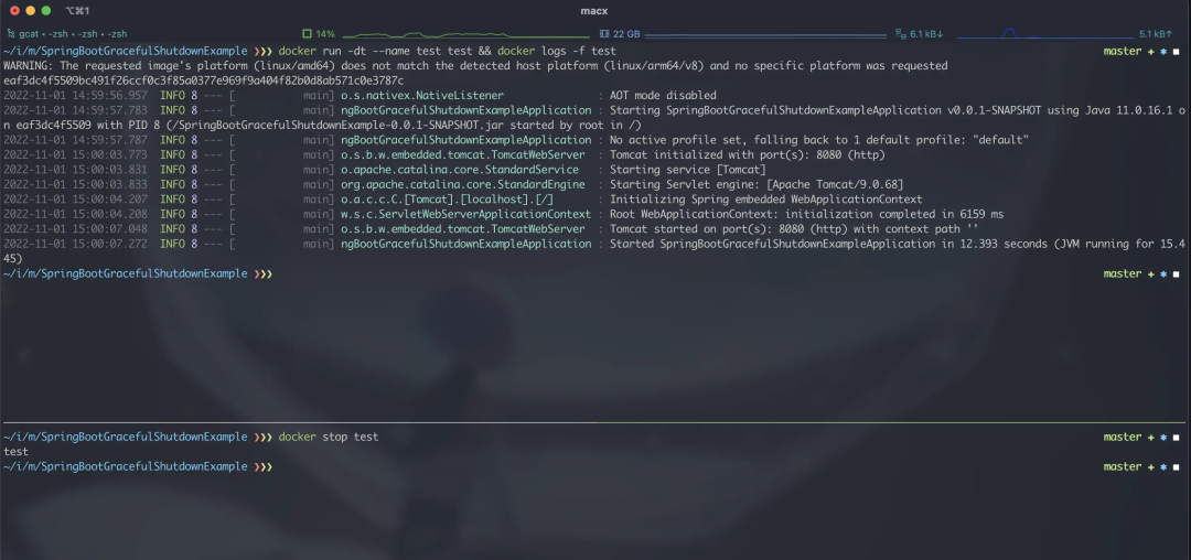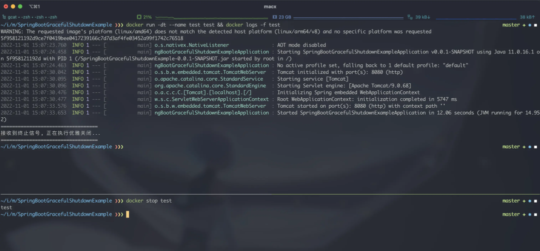 可以看到, 在 Dockerfile 中直接运行 java 命令这种方式可以让 jvm 正确的通知应用完成优雅关闭:
