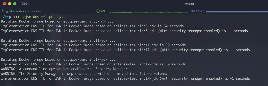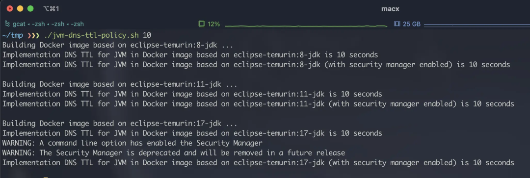 System.out.printf(\"Implementation DNS TTL for JVM in Docker image based on 'eclipse-temurin:${tag}' (with security manager enabled) is %%d seconds\\\\n\", sun.net.InetAddressCachePolicy.get()); \\