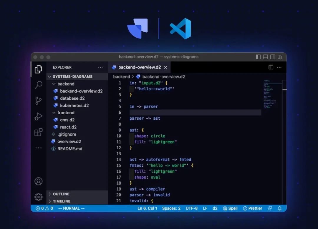 有一个官方的、创建者维护的 VSCode 扩展 https://github.com/terrastruct/d2-vscode,可以通过 VSCode 市场免费搜索和下载。该插件完全支持自动缩进和语法突出显示,使用 D2