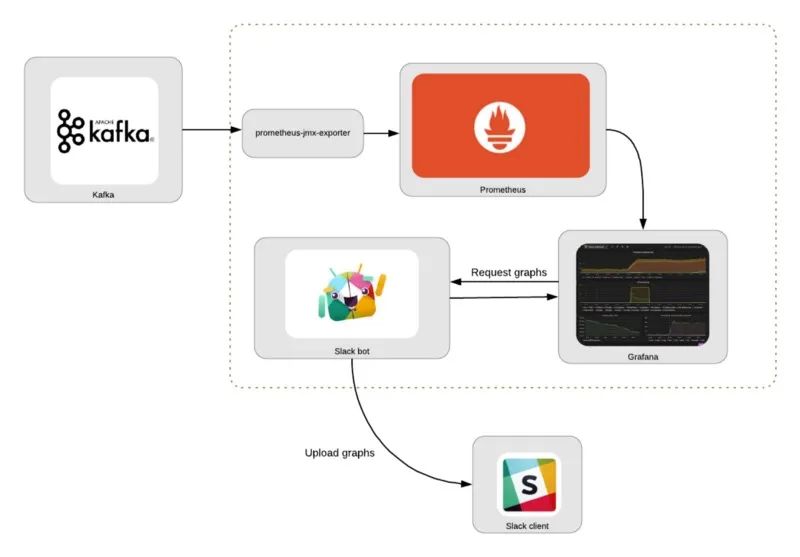 Kafka:一个消息流平台。 Prometheus:一种监控系统,用于按指定的时间间隔收集指标,评估规则并触发警报。 prometheus-jmx-exporter:Prometheus Exporter,可以抓取并暴露 JMX 数据,从而使我们能够从 Kafka 收集指标数据。 Grafana:一个可视化平台,通常用于可视化时间序列数据,以用于基础结构和应用程序分析。这使我们能够以图形方式显示收集的指标。 Slack:消息传递应用程序,它将使我们能够与聊天机器人进行交互。 Slack bot:下面的第二部分中描述了一个简单的 Python 脚本,该脚本可以从 Grafana 检索图形并将其上传到 Slack。