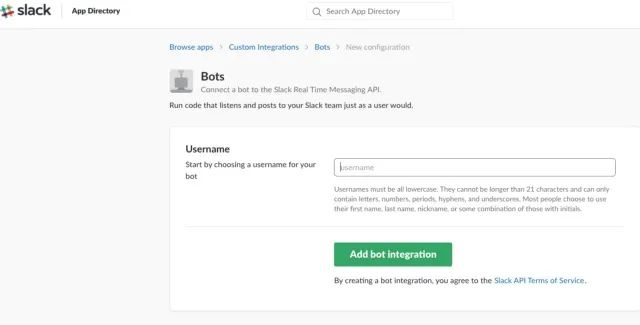 第一步是在 Slack 网站上创建和注册机器人,你可以通过登录 Slack,进入 https://api.slack.com/bot-users
