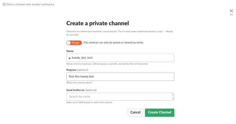 此外还可以自定义细节,例如为机器人添加一个图标和描述。当你的机器人被创建后,接着你可以创建一个私人频道进行测试。