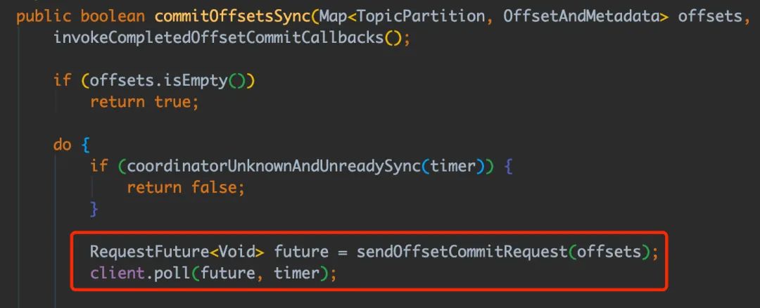 消费阶段采用和生产阶段类似的确认机制来保证消息的可靠性,客户端从 Broker 拉取消息后,执行业务逻辑,成功后才会给 Broker 发送消费确认响应。如果 Broker 没有收到消息的消费确认响应,重启后就会从提交的消息下一个位置开始消费,确保消息不会因为消费后没执行业务逻辑宕机导致消息丢失。(1)这个阶段的消息丢失主要是是由没处理完消息但还提交了消费确认响应引起的。Kafka 客户端消费的逻辑也大量采用了异步和合并请求的思想:发送请求时,会先构建 Request,暂存到发送队列 unsent,等待合适的时机发送,在收到 Broker 的响应结果后也不会立刻处理,也是暂存到队列中,同样是择机批量处理。客户端与 Broker 交互都采用 NIO 多路复用的网络模型,线程不用阻塞等待网络 IO 响应。Kafka 的消费确认响应就是提交 offset(每个消息都有一个 offset 标识,消费者启动时会从提交 offset 位置的下一条消息开始消费),在 Kafka 中有三种提交 offset 的方式:自动提交、异步手动提交、同步手动提交。当 Consumer 实例设置配置项为 enable.auto.commit=true 就代表开启了自动提交 offset。在调用 poll 方法时,拉取消息之前会判断两个条件:是否开启自动提交offset(配置项:enable.auto.commit)、距离上次提交是否大于等于配置间隔(配置项:auto.commit.interval.ms),满足以上两个条件会触发一次异步的 offset 提交(提交上次消费消息的 offset):// 消费相关部分源码