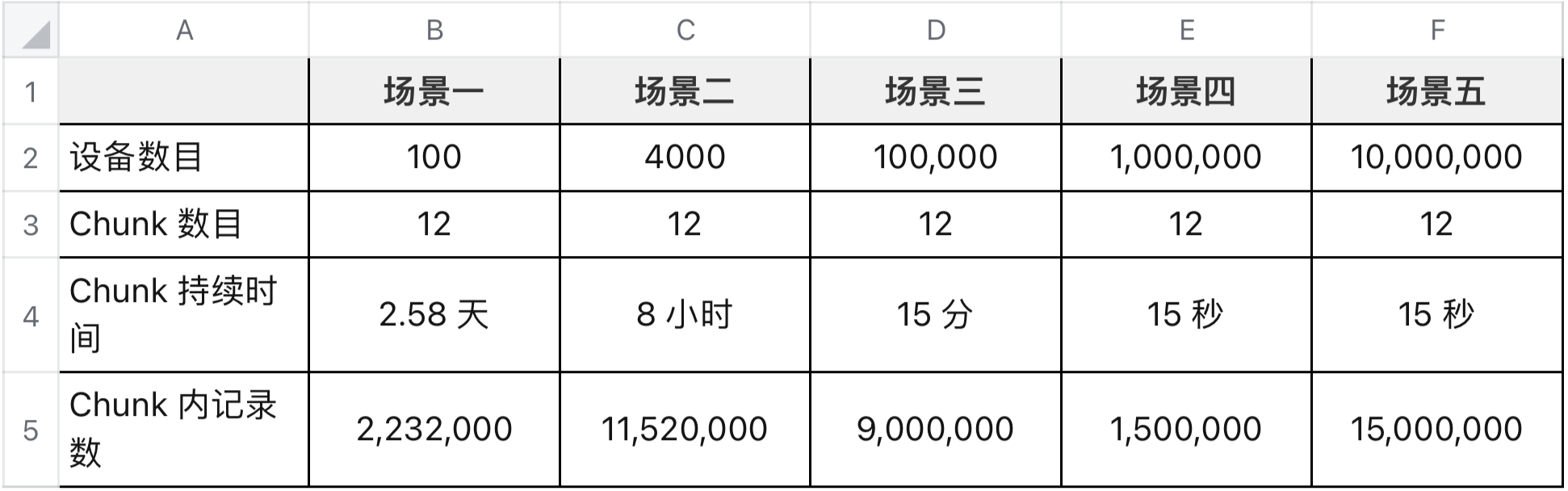 为确保结果具有可比性,本次测试选用 TimescaleDB 2.6.0 版本。为获得较好的性能,TimescaleDB 需要针对不同的场景设置不同的 Chunk 参数,不同场景下参数的设置如下表所示: