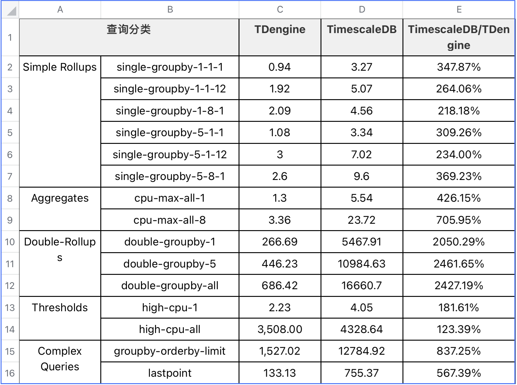 对于场景一(100 devices x 10 metrics),TSBS 的 15 个查询对比结果如下: