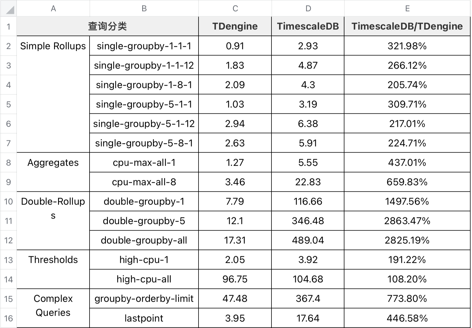 如上表所示,从更小规模的数据集(100 设备)上的查询对比可以看到,整体上 TDengine 同样展现出极好的性能,在全部的查询语句中全面优于 TimescaleDB,部分查询性能超过 TimescaleDB 28 倍。