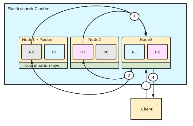 我们首先来看下 ES 总体的查询模型。ES 的任意节点可作为写入请求的协调节点,接收用户请求。协调节点将请求转发至对应一个或多个数据分片的主或者从分片进行查询,各个分片查询结果最后在协调节点汇聚,返回最终结果给客户端。