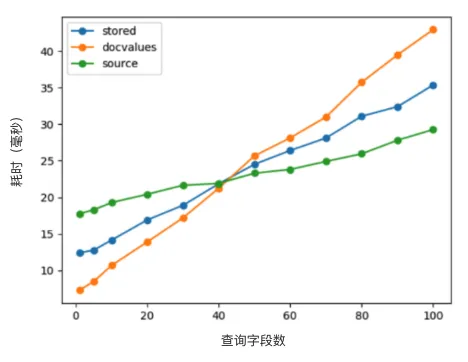 我们在上面提到,ES 存储字段的类型这么多,那么我们最关心的不同类型字段的拉取性能究竟有什么区别呢?我们基于8C 32G 规格,构建100w 条测试数据(每条数据包含100个字段)不断变化查询字段数进行查询,得到查询耗时的结果如下。我们可以看到,通过不同方式拉取字段的性能是存在一个平衡点的,大约在40左右。
