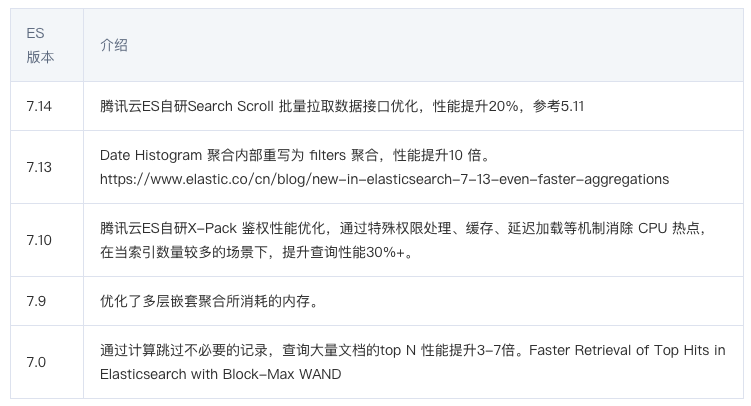 腾讯云ES 基于 Search Scroll 优化内核,降低了查询过程中(反)序列化跟压缩解压的开销, 进一步优化批量拉取数据的性能,具体参考:Search Scroll 查询流程优化, Scroll 查询结果columnar格式优化。
