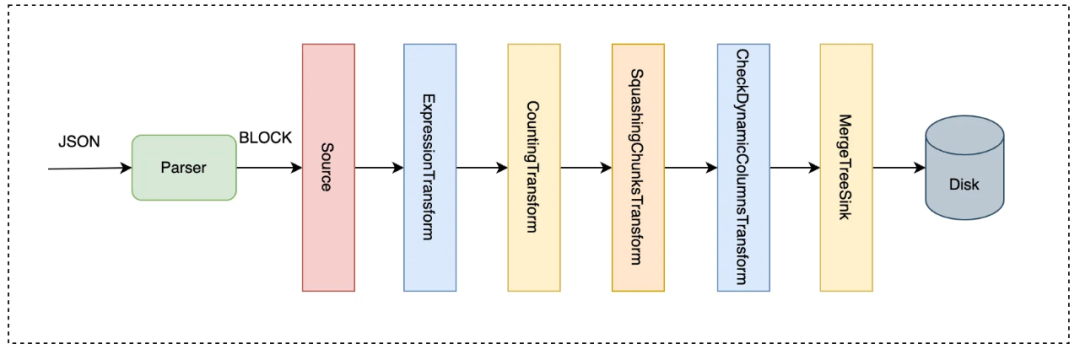 对于支持Schema-less的表引擎而言,服务端收到客户端写入数据后,会被解析为TUPLE类型的数据。将TUPLE类型数据展开,并包装为ClickHouse内部通用的BlockHouse数据结构。构建数据写入的Query Pipeline,并执行。具体过程: