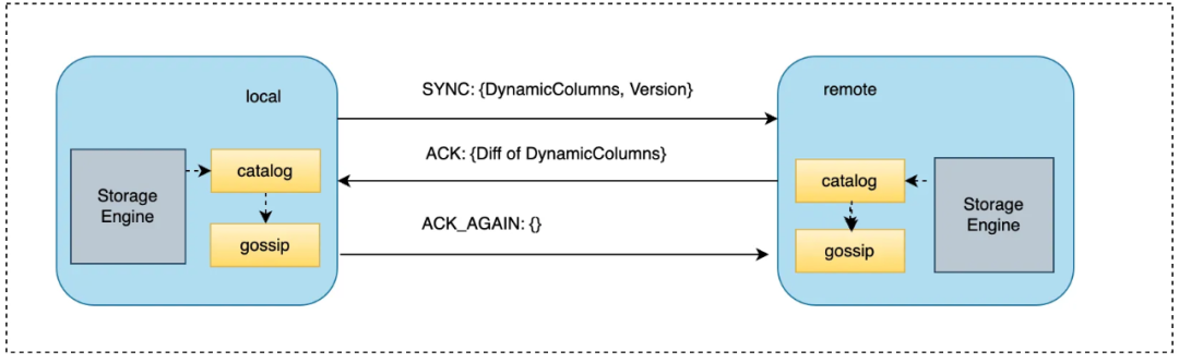 具体而言,对于支持Schema-less的表引擎,每次动态列更新后,其对应的版本信息将递增。动态列信息将会通过GOSSIP协议广播至集群其他节点。每个节点保持了一个后台任务,周期性执行消息广播动作。