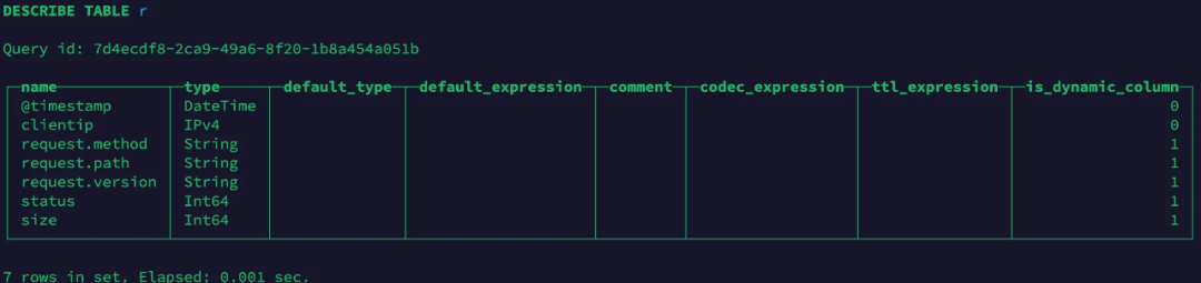 CREATE TABLE r(`@timestamp` DateTime,`clientip` IPv4)ENGINE = MergeTreePARTITION BY toDate(`@timestamp`)ORDER BY clientipSETTINGS enable_dynamic_columns = 1