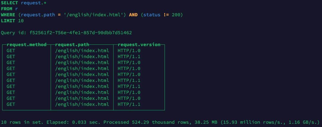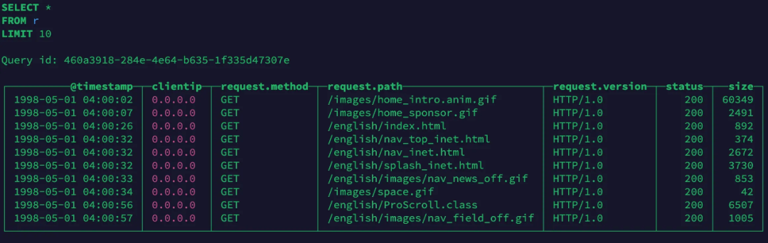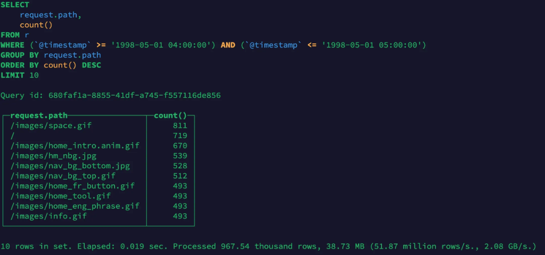 可以看到,用户可以使用ClickHouse 非常方便的对非结构化数据进行分析和查询。