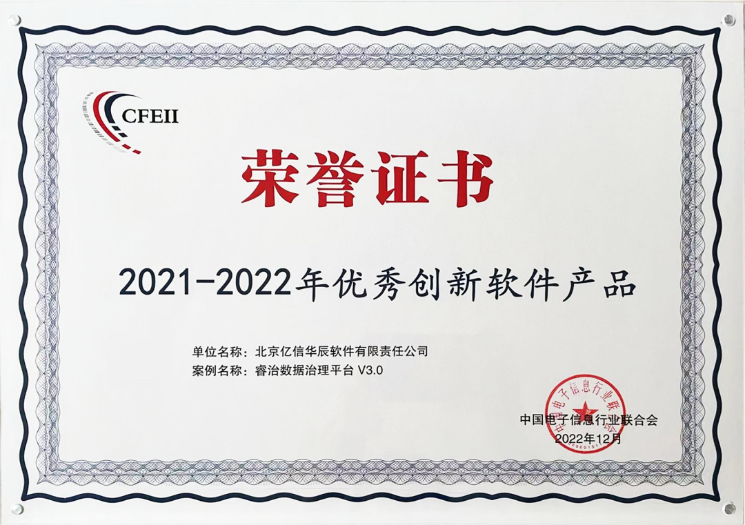 就在刚刚过去的周末,4月15日,由中国电子信息行业联合会、武汉市人民政府、湖北省经济和信息化厅联合主办“首届中国软件创新发展大会”在武汉举行。会上,中国电子信息行业联合会颁发“2021-2022年度优秀创新软件产品推广目录”,亿信华辰睿治数据治理平台获得2021-2022年度优秀创新软件产品的荣誉。