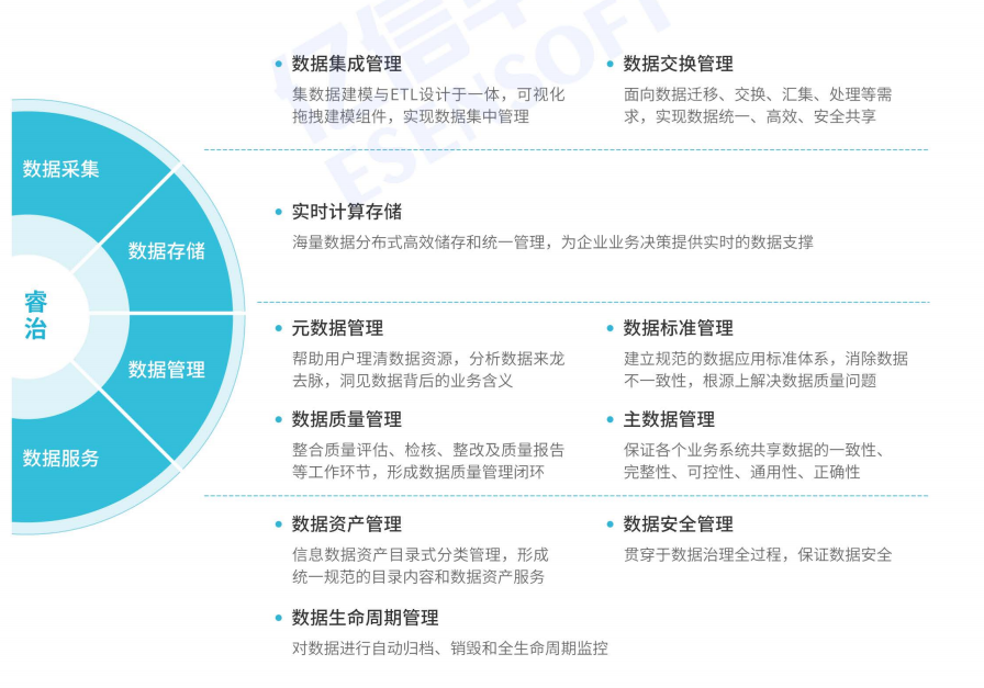 睿治数据治理平台由亿信华辰完全自主研发的,融合了数据集成、数据交换、实时计算存储、元数据管理、数据标准管理、数据质量管理、主数据管理、数据资产管理、数据安全管理、数据全生命周期管理十大功能模块,打通数据治理各个环节。10大模块从数据采集、数据存储、数据管理到数据服务,全面解决企业的数据治理问题。