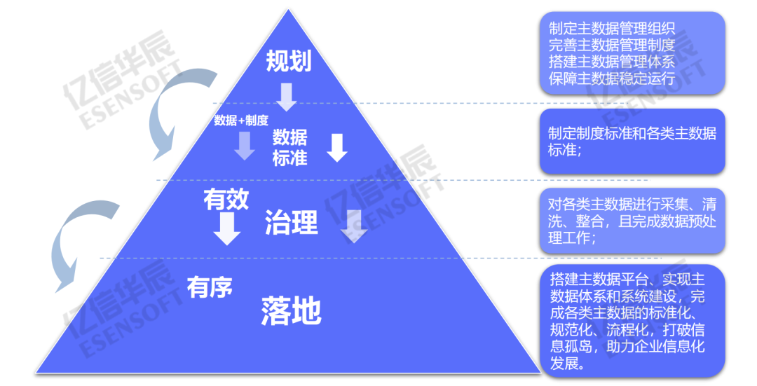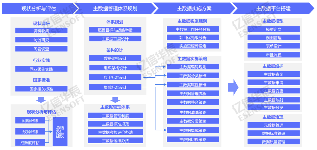 管理体系规划包需要完成愿景目标的确立、不同维度的架构设计,进而最终确立主数据的管理制度、标准规范、考核方法及运维方案,保证后续的实施和运维工作有序高效地进行。