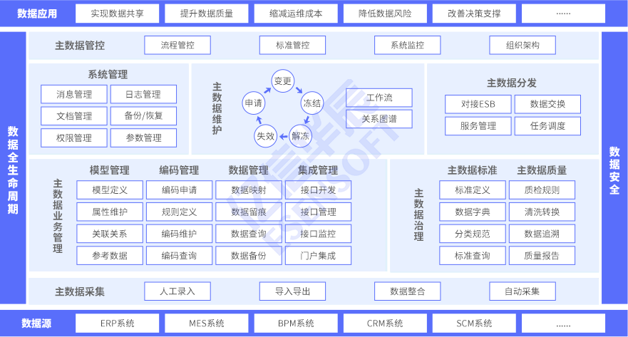 管理实现对主数据采集、申请、新增、变更、审核、生效、失效、分发等全生命周期管理。支持可自定义的质检方案到整改的全流程主数据质量管控服务,确保主数据的完整性、准确性、一致性、及时性和可获取性。