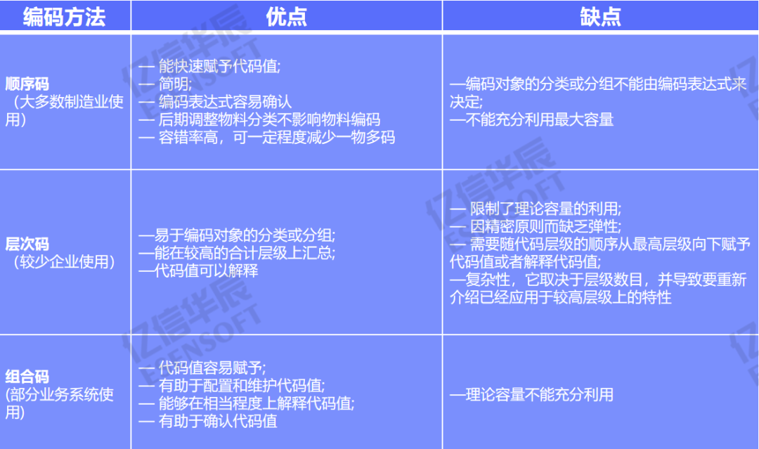 当然,以上三种编码方式他们各有优缺点,如下图所示。我们建议在选择编码方法时,先基于对各编码方法优缺点分析,结合企业自身现状特点,初步选取候选编码方法;然后召集业务人员、技术人员、相关负责人等涉及人员集中讨论,初步达成统一意见;最后形成编码方案,向高层汇报,取得高层确认。