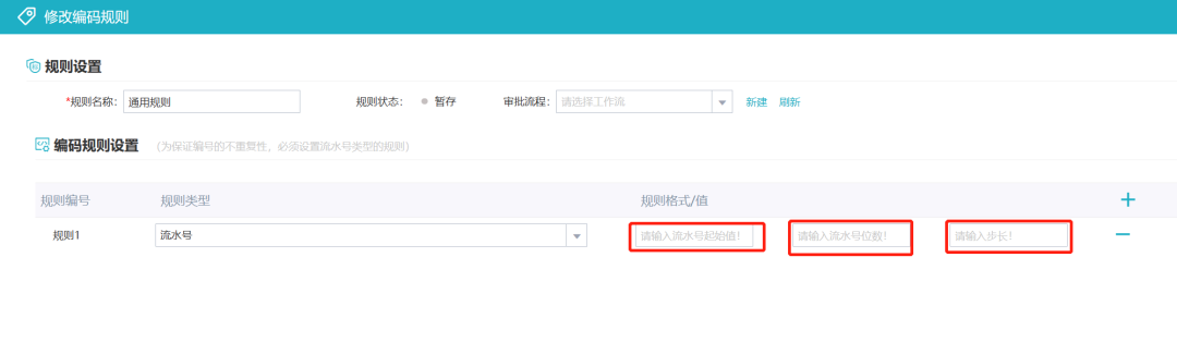 给定一个数字大小范围,有顺序地给数据生成编码。编码规则中可定义长度范围与递增步长。