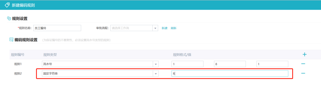 在固定字符串的生成规则中可以随意填写字符串编码条件生成编码。