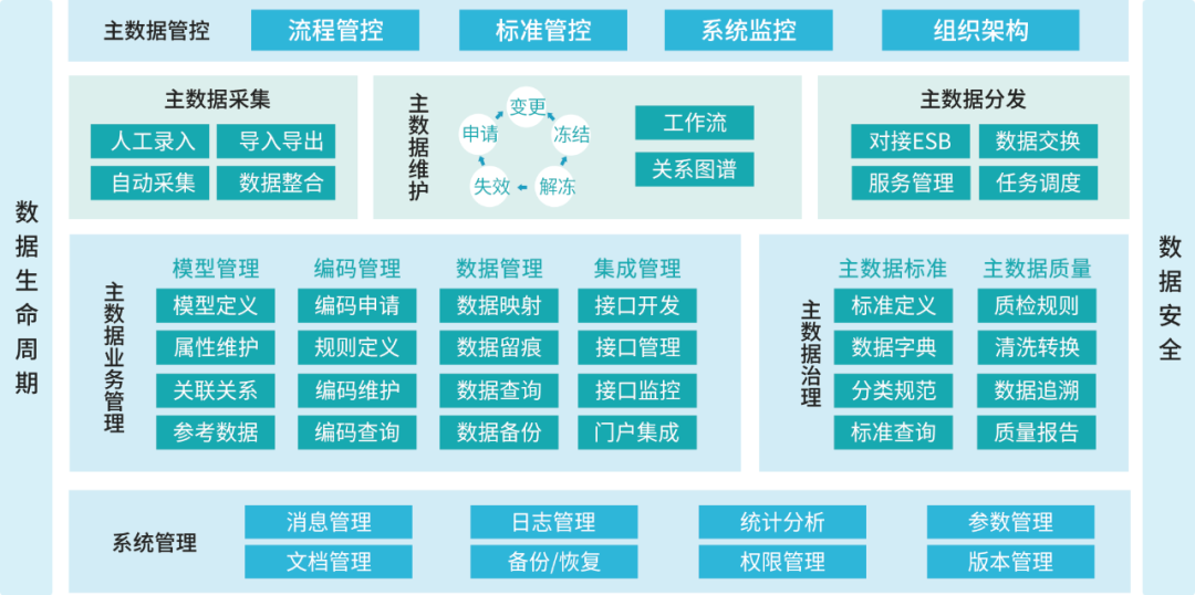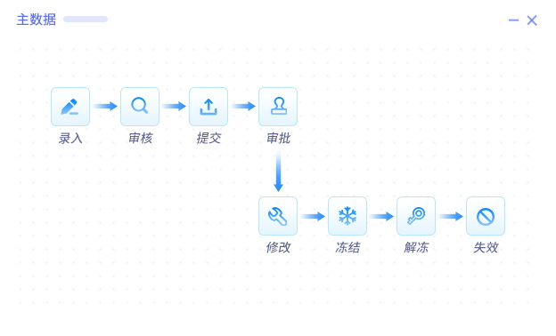 平台支持集中式和分布式方式管理主数据,严格规范主数据的新增、变更、审核等流程,实现对各类主数据的全生命周期管理,可通过手工新增、导入、接口传输等多种方式汇集主数据,并提供全方位质量检查,保证主数据质量。