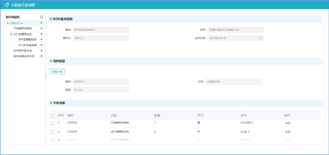针对制造行业中常见的BOM类型主数据的管理,可在产品中通过引用现有各类主数据实现物料组成关系,同时可以通过表单填报完善数据信息。