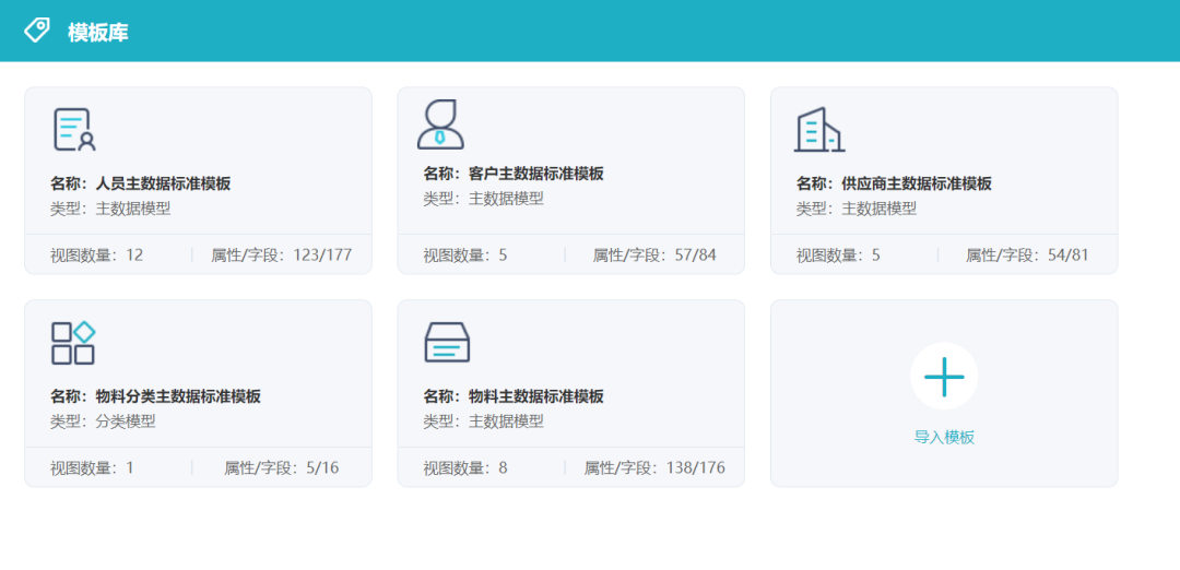 通过引用主数据模板满足用户快速搭建主数据模型的需求,平台内置物料分类属性清单、物料属性清单、客户属性清单、供应商属性清单、人员属性清单等标准模板,提高主数据管理员模型创建效率以及标准化。