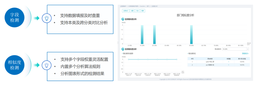 在主数据维护过程中,往往存在大量重复数据,通过对主数据进行不同程度的相似度设置后,用户在申请主数据时能够快速检测到相似数据避免重复录入,保证主数据的准确性与唯一性,同时检测结果能够生成独立的相似度报告,提高数据质量。