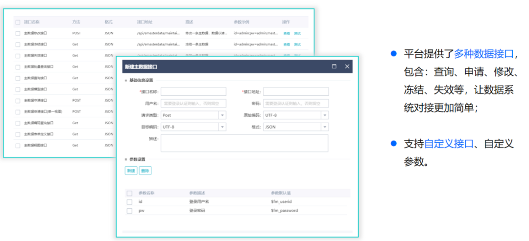 平台提供丰富的数据集成接口,实现与业务系统的数据交换分发,为各信息系统提供高质量的主数据服务。例如主数据查询接口、主数据申请接口、主数据视图接口等,囊括了企业大部分的数据维护应用场景,用户仅需简单配置即可使用接口,极大提升了系统对接效率,同时还可以支持用户在平台中维护自定义接口信息,使用上更加灵活。