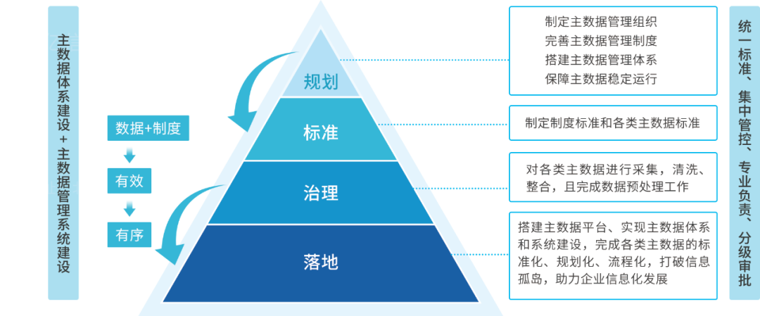 建设内容:项目建设达成“四个一”,即一个体系建设,建立各业务板块都能通用的主数据管理体系,以满足集团主数据管理精细度的需求;一套组织规划,建立主数据管理的基础能力,设置合适的标准化组织、流程机制与平台固化主数据管理的工作,实现数据分级管理;一套落地标准,按照新制定标准逐步规范统一全集团主数据,保证各个系统中的主数据标准一致,主要包括属性标准、编码标准、流程标准等统一;一套主数据管理平台,实现与核心系统数据分发集成。