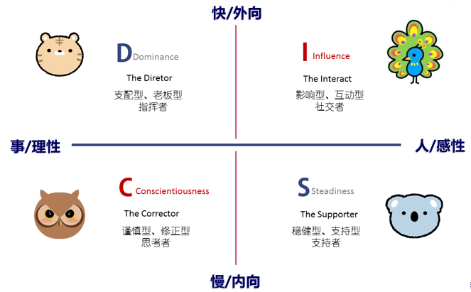 还有一种具象的分类呢,更好理解和记忆一些,用动物进行类比划分。D是老虎型,I是孔雀型,C是猫头鹰,S就是考拉。