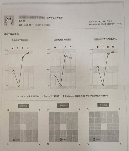 DISC测评结果是包含多个维度的,每个人不一定会被严格规范于某一类型,通常是同时具有多种特质的,比如笔者就是CS类型,笔者团队中还有小伙伴是IDC类型。