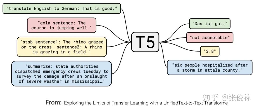 首先,Google的T5模型,在形式上统一了自然语言理解和自然语言生成任务的外在表现形式。如上图所示,标为红色的是个文本分类问题,黄色的是判断句子相似性的回归或分类问题,这都是典型的自然语言理解问题。在T5模型里,这些自然语言理解问题在输入输出形式上和生成问题保持了一致,也就是说,可以把分类问题转换成让LLM模型生成对应类别的字符串,这样理解和生成任务在表现形式就实现了完全的统一。