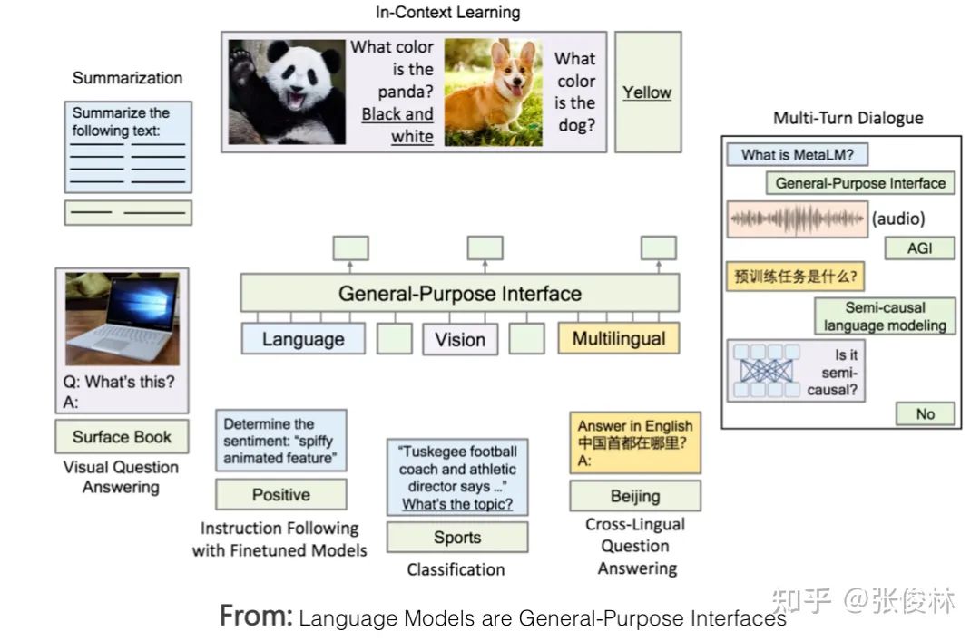 LLM从NLP向外进行领域拓展,一个自然的选择就是图像处理及多模态相关任务。目前已经有些工作在尝试把多模态融入,让LLM成为一个支持多模态输入输出的通用人机接口,典型的例子包括DeepMind的Flamingo和微软的“Language Models are General-Purpose Interfaces”,上图展示了这种方式的概念结构。