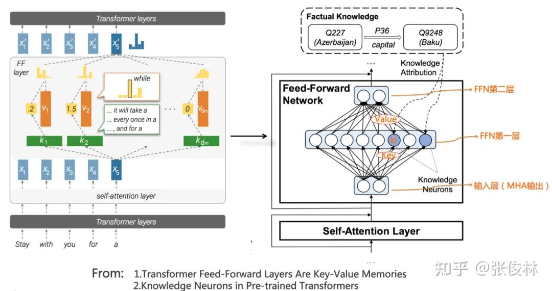 显然,知识一定存储在Transformer的模型参数里。从Transformer的结构看,模型参数由两部分构成:多头注意力(MHA)部分占了大约参数总体的三分之一,三分之二的参数集中在FFN结构中。MHA主要用于计算单词或知识间的相关强度,并对全局信息进行集成,更可能是在建立知识之间的联系,大概率不会存储具体知识点,那么很容易推论出LLM模型的知识主体是存储在Transformer的FFN结构里。
