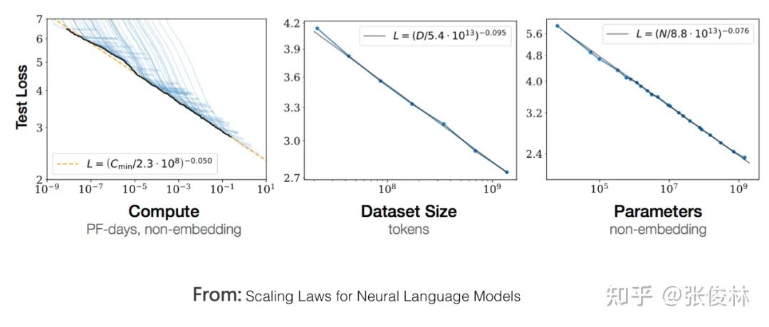 首先,我们先看在预训练阶段,随着模型规模逐步增大,会发生什么。OpenAI在“Scaling Laws for Neural Language Models”中专门研究了这个问题,并提出LLM模型所遵循的“伸缩法则”(scaling law)。如上图所示,这个研究证明:当我们独立增加训练数据量、模型参数规模或者延长模型训练时间(比如从1个Epoch到2个Epoch),预训练模型在测试集上的Loss都会单调降低,也就是说模型效果越来越好。