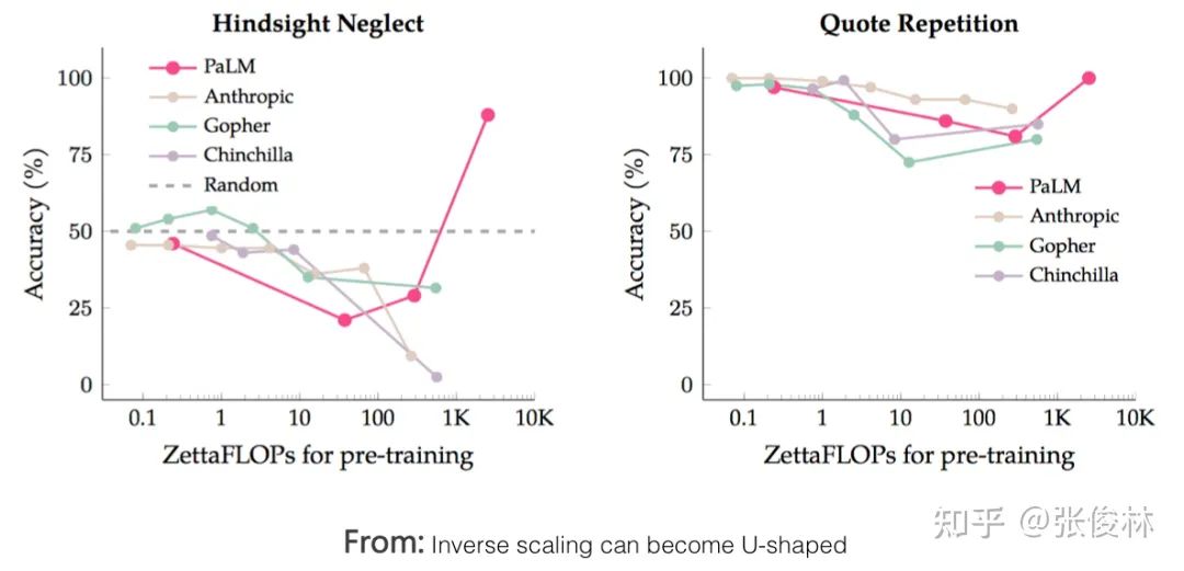 第二类任务展现出LLM具备某种“涌现能力(Emergent Ability)”,如上图(b)所示。所谓“涌现能力”,指的是当模型参数规模未能达到某个阀值时,模型基本不具备解决此类任务的任何能力,体现为其性能和随机选择答案效果相当,但是当模型规模跨过阀值,LLM模型对此类任务的效果就出现突然的性能增长。也就是说,模型规模是解锁(unlock)LLM新能力的关键,随着模型规模越来越大,会逐渐解锁LLM越来越多的新能力。这是个很神奇的现象,因为它意味着如下让人对未来可报乐观预期的可能:或许很多任务,目前LLM还不能很好地解决,甚至站在现在这个时刻的我们看起来,LLM完全没有能力解决这类任务,但因LLM具备“涌现能力”,所以如果我们继续推大模型,也许某一天它的这项能力就被突然解锁了。LLM模型的规模增长会给我们带来意想不到的精彩礼物。