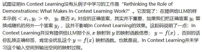 有些工作认为LLM还是从给出的示例学习了这个映射函数y=f(x),不过是种隐式地学习。比如“What learning algorithm is in-context learning? Investigations with linear models”认为Transformer能够隐式地从示例中学习 x 到 y 的映射过程,它的激活函数中包含了一些简单映射函数,而LLM通过示例能够激发对应的那一个。而“Why Can GPT Learn In-Context? Language Models Secretly Perform Gradient Descent as Meta-Optimizers”这篇文章则将ICL看作是一种隐式的Fine-tuning。