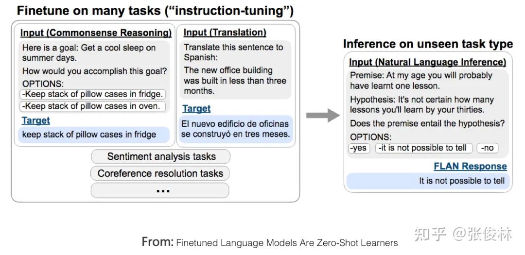我们先来看第一种:偏学术研究的Instruct。它的核心研究主题是多任务场景下,LLM模型对Instruct理解的泛化能力。如上图中FLAN模型所示,就是说有很多NLP任务,对于每个任务,研究人员构造一个或者多个Prompt模版作为任务的Instruct,然后用训练例子对LLM模型进行微调,让LLM以同时学习多个任务。训练好模型后,给LLM模型一个它没见过的全新任务的Instruct,然后让LLM 解决zero shot任务,从任务解决得是否足够好,来判断LLM模型是否有对Instruct理解的泛化能力。