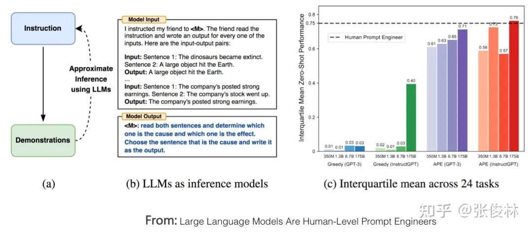 目前有零星的工作在探索这个问题,我认为这个方向是很有研究价值的。先说答案,答案是:Yes,LLM Can。“Large Language Models Are Human-Level Prompt Engineers”是做这个方向很有趣的工作,如上图所示,对于某项任务,给LLM一些示例,让LLM自动生成能够描述这项任务的自然语言命令,然后它再用LLM生成的任务描述去测试任务效果。它使用的基础模型是GPT 3和InstructGPT,经过这项技术加持后,LLM生成的Instruct的效果相比未采用这项技术的GPT 3 以及InstuctGPT来说,指标有极大地提升,而且在一些任务上超过人类的表现。
